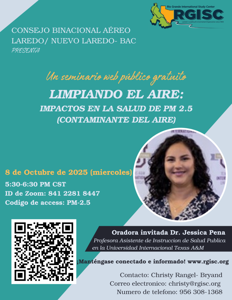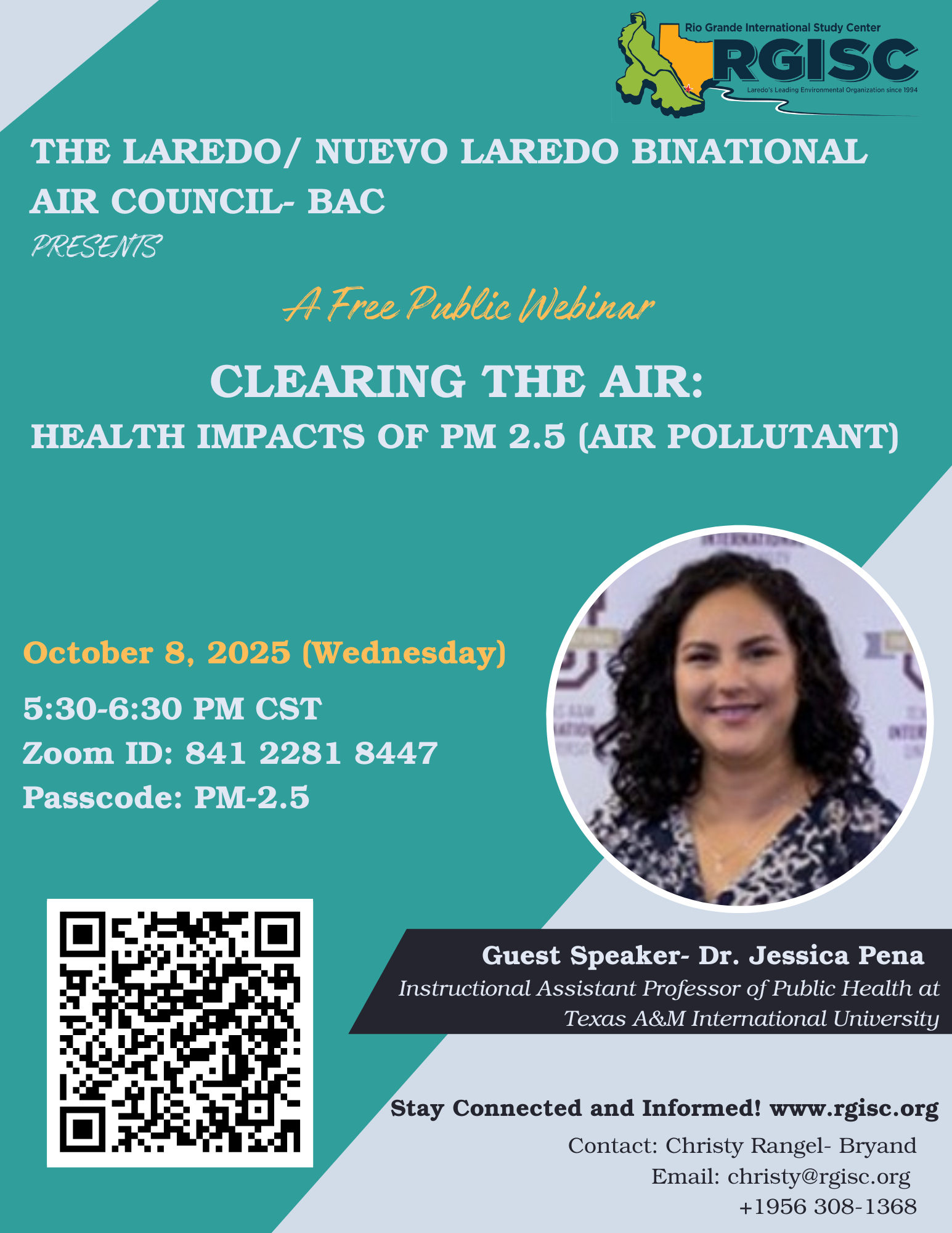 The Binational Air Council (BAC) Laredo/Nuevo Laredo, in partnership with RGISC, invites the community to a free public webinar: “Clearing the Air: Health Impacts of PM2.5.”